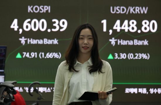 코스피가 연일 사상최고가를 갈아치우며 고공행진하고 있는 가운데 7일 서울 중구 하나은행 본점 딜링룸 현황판에 코스피, 원/달러환율, 코스닥 등이 표시돼 있다. 이날 코스피 지수는 전 거래일 대비 40.86포인트(0.90%) 오른 4,566.34에, 코스닥은 1.77포인트(0.19%) 오른 957.74에 개장했다.
