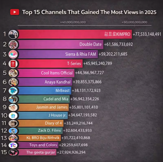 한국인 남녀가 운영하는 유튜브 채널 '김프로(KIMPRO)'가 전 세계 유튜브 채널 가운데 연간 조회 수 1위를 기록했다. 유튜브 채널 분석 사이트 플레이보드에 따르면 김프로의 지난해 연간 총조회 수는 약 775억회로 집계됐다. 이는 약 615억회를 기록한 2위 채널 '더블데이트(Double Date)'를 크게 앞선 기록이자 전 세계에서 가장 많은 구독자를 보유한 유튜버 미스터 비스트(MrBeast)의 연간 조회 수 약 381억회를 두 배 이상 웃도는 수치다.