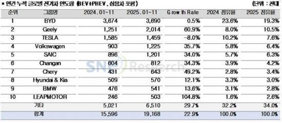 BYD는 전년 동기 대비 0.5% 증가한 약 369만대 전기차를 판매했다. 자체 배터리 기술과 차량 원가 경쟁력을 기반으로 브랜드 인지도를 지속해서 끌어올리고 있는 것으로 풀이된다.