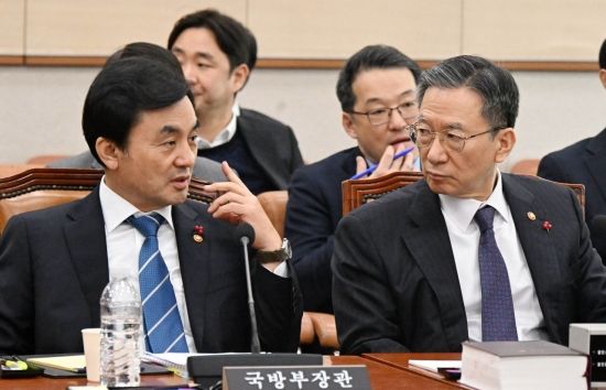 정성호 법무부 장관(오른쪽)과 안규백 국방부 장관이 7일 국회에서 열린 법제사법위원회 전체회의에서 대화하고 있다.