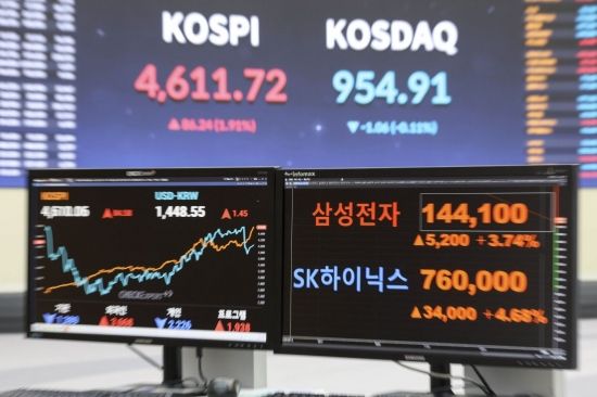 코스피 지수가 4600을 돌파하며 삼성전자와 SK하이닉스 주가가 연일 최고가를 경신하고 있는 7일 서울 여의도 한국거래소에 국내증시 현황과 삼성전자, SK하이닉스 주가가 표시돼 있다. 2026.1.7 강진형 기자