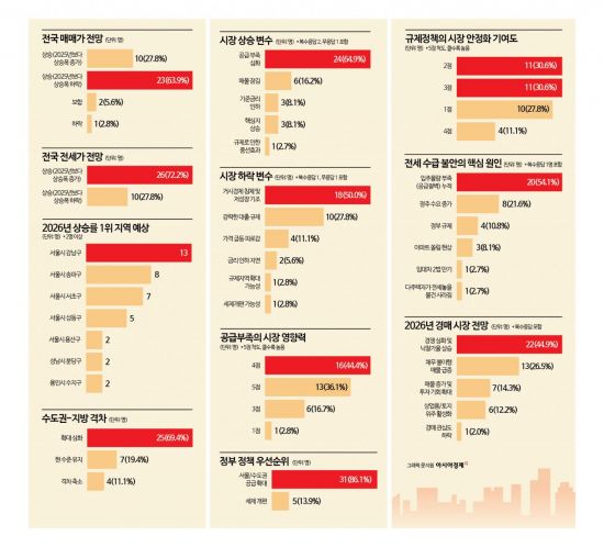 반면 시장 하방 압력으로는 거시경제의 침체(50.0%, 18명)와 강력한 대출 규제(27.8%, 10명)가 1, 2위 요인으로 꼽혔다. 하락 요인조차 정부의 정책 영향력보다는 거시경제 상황에 의한 강제적 제약이 더 큰 영향력을 발휘할 것으로 예상한 것이다. 가격 급등 피로감(11.1%, 4명), 금리 인하 지연(5.6%, 2명), 규제지역 확대 가능성과 세제개편 가능성이 각각 1명(2.8%)으로 뒤를 이었다.