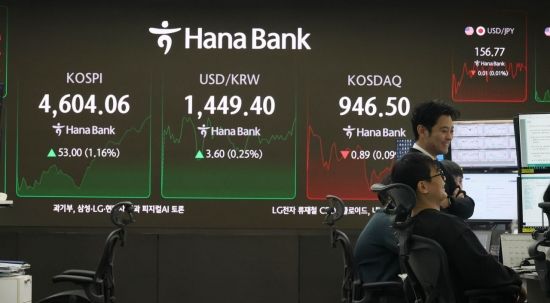 코스피가 하락 출발했지만 10시 5분 현재 4600선을 재돌파한 8일 서울 중구 하나은행 본점 딜링룸 현황판에 코스피, 원/달러환율, 코스닥 등이 표시돼 있다. 이날 코스피는 전장보다 19.60p(0.43%) 내린 4,531.46로 원/달러 환율은 전장보다 3.9원 오른 1,449.7원으로 시작했다.