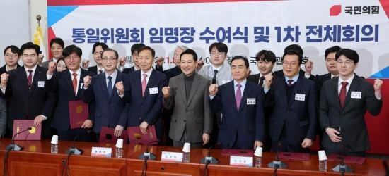 장동혁 국민의힘 대표가 8일 국회에서 열린 통일위원회 임명장 수여식에서 김기웅 위원장을 비롯한 위원들과 기념촬영을 하고 있다.