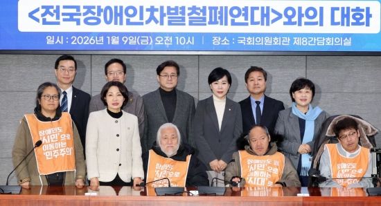 김영배, 서영교, 전현희, 박주민, 박홍근 등 더불어민주당 의원들과 박경석 전장연 상임대표 등 참석자들이 9일 국회 의원회관에서 열린 전국장애인차별철폐연대와의 대화에서 기념촬영하고 있다. 2026.1.9 김현민 기자