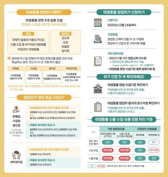 '야생동물 영업허가제'는 '야생생물 보호 및 관리에 관한 법률' 개정(2022년 12월 13일)에 따라 3년간의 유예기간을 거쳐 지난 2025년 12월 14일부터 시행됐다. 이에 따라 살아있거나 알 상태의 야생동물을 일정 규모 이상 취급하는 영업자는 반드시 관할 지자체의 허가를 받아야 한다.