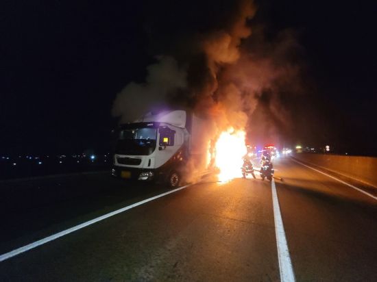 9일 오전 2시 28분께 경남 함안군 칠서면 중부내륙고속도로 대구 방향 칠서나들목(IC) 인근을 달리던 7.5t 화물차에서 '펑' 소리와 함께 불이 났다.