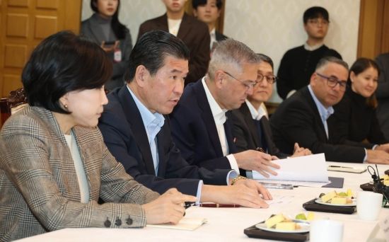 제임스 김 주한미국상공회의소(AMCHAM)회장이 9일 서울 종로구 정부서울청사에서 열린 주한미국상공회의소 초청 간담회에서 발언하고 있다.