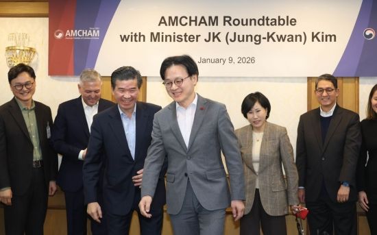 김정관 산업통상부 장관이 9일 서울 종로구 정부서울청사에서 열린 주한미국상공회의소(AMCHAM) 초청 간담회에 참석, 제임스 김 암참 회장 등과 기념촬영을 마치고 자리로 이동하고 있다.