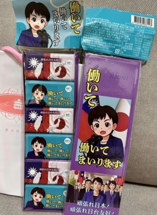 대만의 식품업체인 이메이식품은 다카이치 총리 취임을 기념해 관계자들에게 '다카이치 내각 탄생 기념 대만·일본 우호 초콜릿'을 제작해 배포했다. 이 초콜릿은 다카이치 총리에게 축하의 메시지를 인쇄한 버전과 일본에서 다카이치 총리 발언으로 유행어가 된 '일하고 일하고 일하고 일하고 일 하겠습니다'라는 문구를 넣은 일러스트 버전 두 가지로 제작됐다. 당초 비매품이었던 '다카이치 초콜릿'은 뉴스와 SNS 등을 통해 명성을 얻은 뒤 지난달 초부터 이메이식품 직영점에서 주문 판매하고 있다.