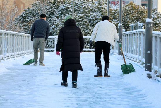 광주와 전남 전역에 강풍과 한파 특보가 발효된 가운데, 오늘 밤부터 내일까지 최고 20㎝ 이상의 많은 눈이 내릴 것으로 예보됐다. 사진은 새해 첫 출근일인 지난 2일 광주 서구 유촌동에서 구청 직원들이 내린 눈에 덮인 육교의 눈을 치우고 있는 모습. 연합뉴스