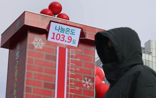 12일 서울 종로구 광화문 광장에 설치된 사랑의 온도탑에 나눔온도가 103.9도를 나타내고 있다. 사랑의열매 사회복지공동모금회는 이날 '희망2026나눔캠페인'의 사랑의 온도탑 나눔 온도가 전날 100도를 돌파했다고 밝혔다.
