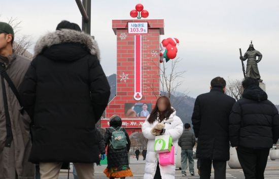 12일 서울 종로구 광화문 광장에 설치된 사랑의 온도탑에 나눔온도가 103.9도를 나타내고 있다. 사랑의열매 사회복지공동모금회는 이날 '희망2026나눔캠페인'의 사랑의 온도탑 나눔 온도가 전날 100도를 돌파했다고 밝혔다.