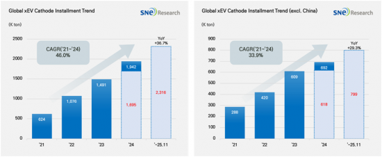 12일 이차전지 시장 조사 업체 SNE리서치에 따르면 2025년 1~11월 전 세계 전기차(순수전기차·플러그인하이브리드차·하이브리드차) 에 투입된 양극재의 총적재량은 2316킬로톤(Kton)으로 전년 같은 기간보다 36.7% 증가했다.