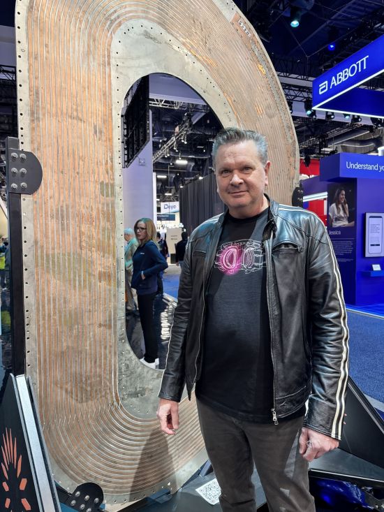조 팔루스카 커먼웰스 퓨전 시스템(CFS) 최고마케팅책임자가 CES 2026에 전시된 고온초전체 자석 앞에서 포즈를 취하고 있다. 이 자석은 1억도의 온도에서 핵융합을 이끌어내 발전할 수 있는 기반이다. 사진=백종민 테크스페셜리스트