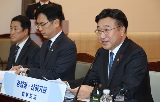 윤호중 행정안전부 장관이 12일 서울 종로구 정부서울청사에서 열린 경찰청을 비롯해 경찰공제회, 총포화약안전기술협회, 한국도로교통공단 등 산하기간 3곳에 대한 업무보고에 앞서 모두발언을 하고 있다.