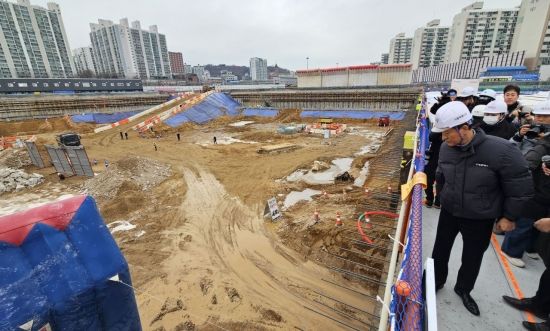 오세훈 서울시장이 12일 서울 노원구 월계동 광운대역 물류부지 공사현장을 찾아 HDC현대산업개발이 시공중인 'SEOUL ONE' 현장 시찰을 하고 있다.