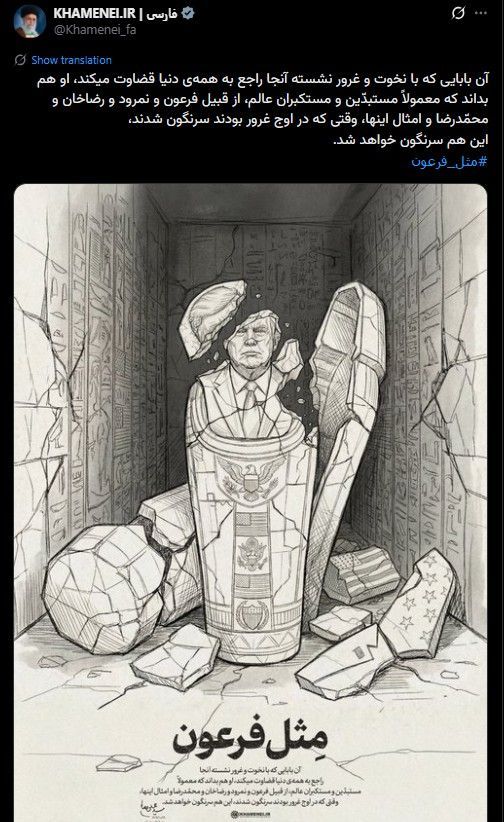 미국 CNN 방송에 따르면 이란 최고지도자 아야톨라 세예드 알리 하메네이는 12일(현지시간) 새벽 공식 엑스(X·옛 트위터) 계정에 트럼프 대통령을 무너지는 이집트 석관(石棺)으로 표현한 삽화를 게시했다. 이 그림은 도널드 트럼프 미국 대통령의 상반신을 본뜬 고대 이집트 양식의 석관이 박살 나 산산이 부서지는 장면을 담고 있다. 석관에는 미국 국기인 성조기와 함께 미국의 국조(國鳥)인 흰머리수리를 상징하는 문양도 새겨져 있다.