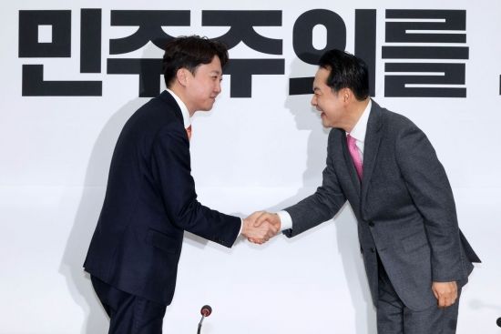 장동혁 국민의힘 대표(오른쪽)과 이준석 개혁신당 대표가 13일 국회에서 만나 악수하고 있다.