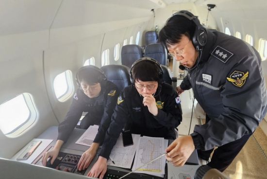 장인식 해양경찰청장 직무대행이 13일 오전 항공기를 이용해 서해권 연안 조업선 및 낚시어선의 조업 실태를 점검하고, 외국어선의 불법조업 행위에 대한 엄정 단속을 주문하고 있다. 해양경찰청 제공