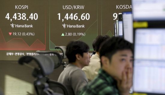 코스피 지수가 전 거래일 대비 12.33포인트 하락한 4445.19에 장을 시작한 6일 서울 중구 하나은행 딜링룸 전광판에 국내증시 지수가 표시돼 있다. 2026.1.6 강진형 기자
