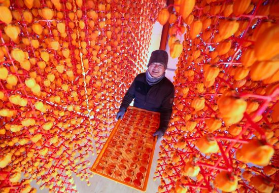 경남 함양군 함양읍 곰 실 곶감 농원 박효기 씨가 '제10회 지리산 함양 고종시 곶감 축제'에서 선보일 자연 바람에 잘 말린 고종시 곶감을 채반에 담아 들어 보이고 있다.