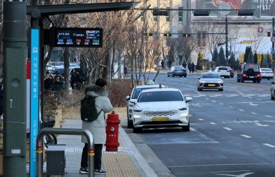 서울 시내버스 파업이 이틀째 이어지고 있는 14일 서울시내 한 버스 정류장에서 택시가 승객을 기다리고 있다.