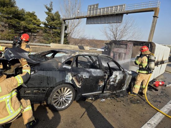 이 사고로 트럭은 오른쪽으로 쓰러졌고 승용차에서는 불이 나 승용차 1대와 트럭 절반이 불탔다.