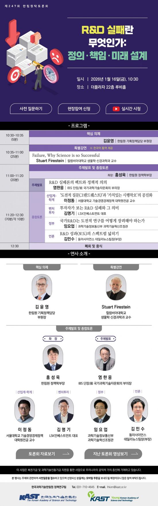 주제발표에서는 염한웅 포항공과대학교(POSTECH) 물리학과 교수(IBS 연구단장)가 한국 R&D에서 반복돼 온 '실패 담론'의 구조적 한계를 짚는다. 염 교수는 한국 R&D가 실패를 회피하고 있다는 인식 자체가 왜곡된 수치 해석에서 비롯된 측면이 크며, 진짜 문제는 실패를 지식과 데이터로 축적해 정책과 연구 설계에 활용하지 못하는 구조에 있다고 지적할 계획이다.