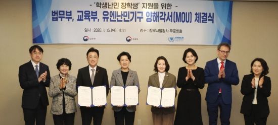이진수 법무부 차관(왼쪽 세번째), 최은옥 교육부 차관(왼쪽 네번째), 김새려 유엔난민기구 한국대표부 대표(오른쪽 네번째) 등 참석자들이 15일 서울 종로구 정부서울청사에서 열린 학생난민 장학생 지원을 위한 법무부-교육부-유엔난민기구 양해각서 체결식에서 기념촬영을 하고 있다.