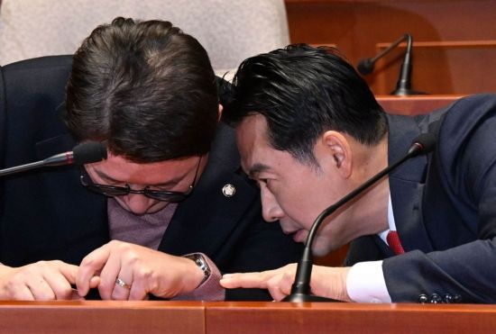 장동혁 국민의힘 대표(오른쪽)과 신동욱 최고위원이 15일 국회에서 열린 의원총회에서 귀엣말을 하고 있다.