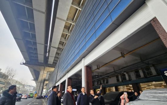 오세훈 서울시장이 15일 서울 서대문구 유진상가를 방문, 상가 위로 지나는 내분순환로를 둘려보고 있다. 오 시장은 지난해 12월 내부순환로와 북부간선도로 20.5km 구간을 지하화하는 ‘강북횡단 지하도시 고속도로’를 발표했다.