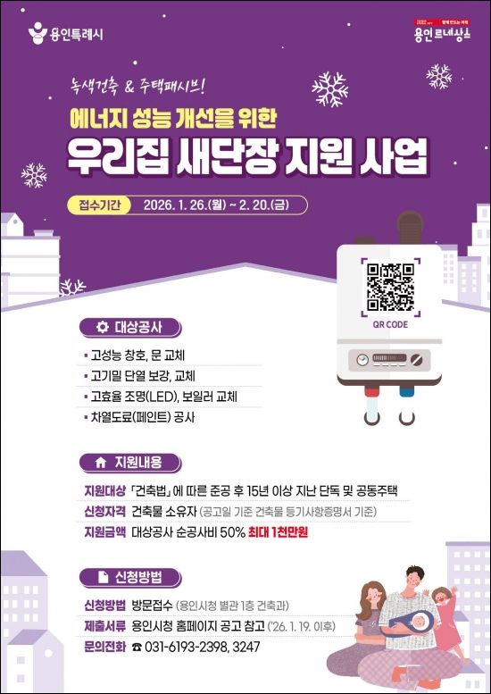 경기도 용인시는 오는 26일부터 다음 달 20일까지 노후주택 에너지 효율 개선을 위한 '우리집 새단장 지원사업' 신청을 받는다고 16일 밝혔다.