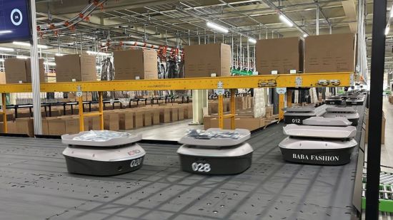 경기도 여주 바바패션 물류센터에서 바바패션이 패션물류 업계 최초로 도입한 빅데이터 기반 AI 자율 물류 로봇 ‘AAGV(Autonomous AI Guided Vehicle)’이 지정된 목적지를 향해 자동으로 상품을 이송하고 분류하는 모습