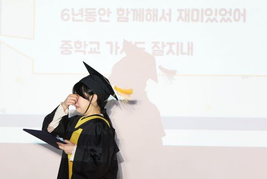 지난 5일 대구 달서구 월곡초등학교에서 열린 졸업식 및 폐교식에서 한 6학년 학생이 눈물을 흘리고 있다. 월곡초는 오는 3월 학령인구 감소를 이유로 폐교하며, 이날 제33회 졸업식과 함께 폐교식을 열었다. 연합뉴스