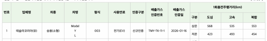 16일 기후환경에너지부 자동차 배출가스 및 소음 인증시스템(KENCIS)에 따르면 테슬라코리아 모델YL은 이날 상온 553㎞와 저온 454㎞(도심·고속 복합 기준)의 1회 충전 주행거리를 인증받았다. 이는 테슬라 중국 공장에서 생산된 모델이다.