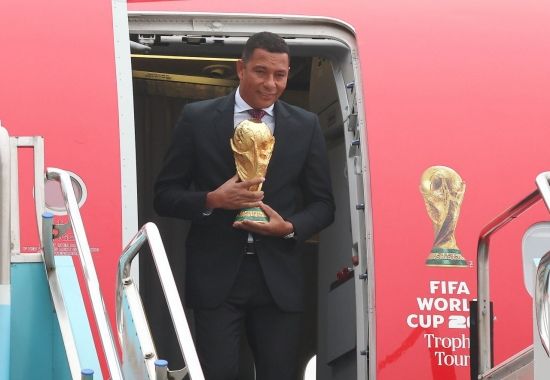 FIFA 전설적 인물인 전 브라질 축구 국가대표 선수 지우베르투 시우바가 16일 서울 김포 비즈니스 항공센터에서 열린 'FIFA 월드컵™ 트로피 투어 by 코카-콜라' 행사에 방한해 FIFA 월드컵 오리지널 트로피를 들고나오고 있다. 공항사진기자단