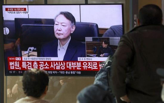 재판부가 윤석열 전 대통령에게 체포 방해와 국무위원 심의권 침해 등 혐의에 대해 1심 징역 5년을 선고한 16일 서울역 대합실에서 시민들이 재판을 보고 있다.