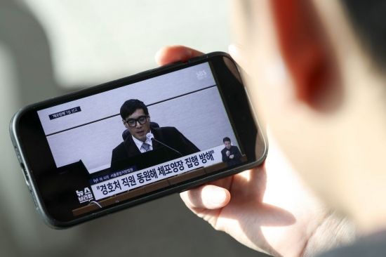 [포토] 휴대전화로 윤석열 전 대통령 1심 선고 보는 시민