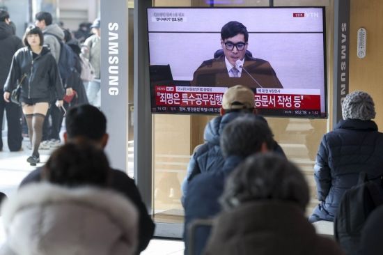재판부가 윤석열 전 대통령에게 체포 방해와 국무위원 심의권 침해 등 혐의에 대해 1심 징역 5년을 선고한 16일 서울역 대합실에서 시민들이 생중계 재판을 보고 있다.