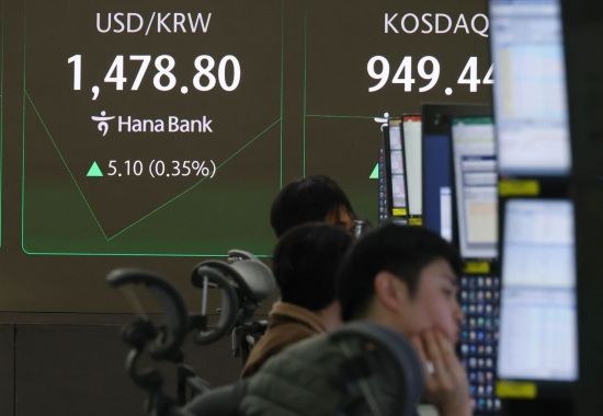 14일 서울 중구 하나은행 본점 딜링룸에서 직원이 증시와 환율을 모니터하고 있다. 이날 원/달러 환율은 일본 엔화 약세 속에 열흘째 상승세를 지속하며 1,480원에 바짝 다가섰다. 이날 서울 외환시장에서 미국 달러화 대비 원화 환율은 오전 9시5분 현재 전날 주간 거래 종가(오후 3시30분 기준)보다 4.6원 오른 1,478.3원이다. 2026.1.14 조용준 기자