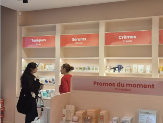 모이다 파리 매장은 규모는 크지 않지만, 3~4명의 직원이 상주하며 고객 한 명 한 명을 1대1로 밀착 응대하는 방식으로 운영된다. 직원들은 제품을 직접 테스트해 보이며 피부 상태와 고민에 맞춰 사용법과 조합을 설명하고 있는 모습.