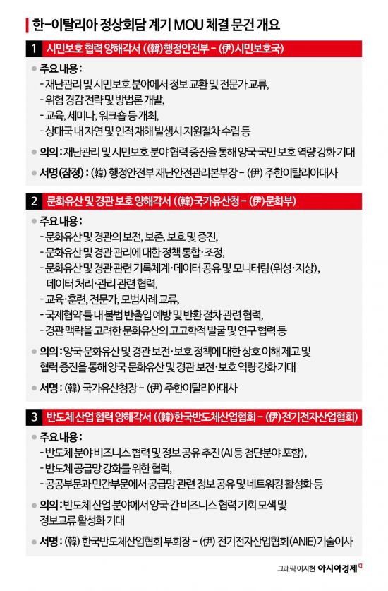 이번 정상회담을 계기로 양국은 ▲시민보호 협력(행정안전부 -시민보호국) ▲문화유산 및 경관 보호(국가유산청장-주한이탈리아대사) ▲반도체 산업 협력(한국반도체산업협회-전기전자산업협회) 등 총 3건의 MOU를 체결했다. 양국은 시민보호 협력 MOU를 통해 재난관리 및 시민보호 분야 정보 교환 및 전문가 교류, 위험 경감 전략 및 방법론 개발 등에 나설 계획이다. 문화유산 및 경관 보호 MOU를 통해서는 문화유산 및 경관의 보전·보존·보호 증진, 문화유산 및 경관 관리에 대한 정책 통합·조정 등 분야에서 협력한다. 아울러 양국은 반도체 산업 협력 MOU를 계기로 반도체 분야 비즈니스 협력 및 정보 공유 추진, 반도체 공급망 강화를 위한 협력 등에 나선다.