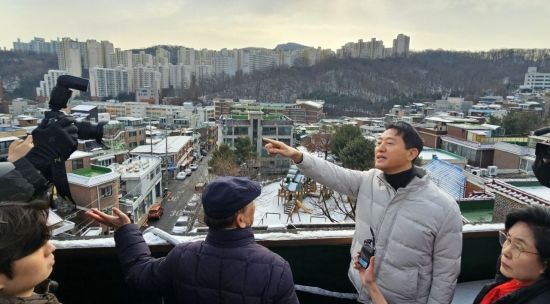 오세훈 서울시장이 19일 서울 관악구 신림7구역 재개발사업 대상지를 찾아 현장 점검을 하고 있다.