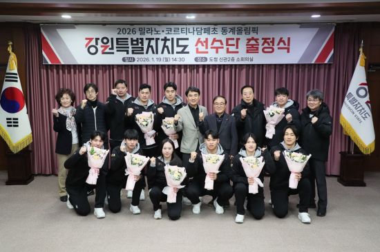 강원특별자치도(도지사 김진태)는 19일 도청 신관 소회의실에서 '2026 밀라노·코르티나담페초 동계올림픽'에 출전하는 도 선수단의 선전을 기원하는 출정식을 개최했다.