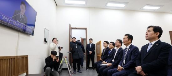 정청래 대표와 한병도 원내대표를 비롯한 더불어민주당 지도부가 21일 국회에서 이재명 대통령 신년 기자회견 생중계를 지켜보고 있다.