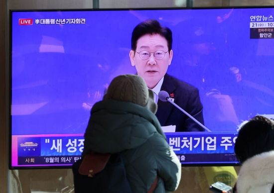 21일 서울 용산구 서울역 대합실에서 시민들이 이재명 대통령 신년 기자회견 방송을 지켜보고 있다.