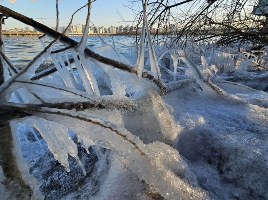 연일 계속되는 강추위에 세상이 꽁꽁 얼어붙고 있다. 21일 서울 여의도 한강변에 얼음이 얼어있다.
