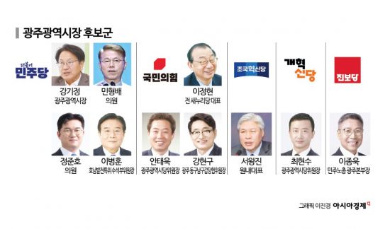 ◇누가 후보자로 거론되나= 민주당은 강 시장, 민형배 의원(광주 광산구을), 정준호 의원(광주 북구갑), 이병훈 호남특위 수석부위원장 등이 후보군이다. 국민의힘은 이정현 전 의원, 안태욱 광주시당위원장, 강현구 동남갑당협위원장 등이 물망에 오른다. 이 밖에 최현수 개혁신당 광주시당위원장, 이종욱 진보당 민주노총 광주본부장, 서왕진 조국혁신당 원내대표 등도 출마 후보군이다.