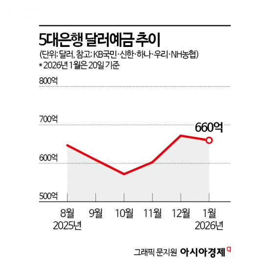 22일 금융권에 따르면 5대 시중은행(KB국민·신한·하나·우리·NH농협)의 20일 기준 달러화 예금 잔액은 약 660억달러로 집계됐다. 이는 지난해 말(672억달러) 대비 12억달러(약 1조7652억원) 감소한 수치다. 달러 예금은 지난해 11월 약 603억달러에서 12월 약 672억달러로 급증한 이후 최근 일부 시중은행에서는 다시 주춤하는 모양새다. 한 시중은행 관계자는 "환율이 연말 대비 상승하면서 환차익을 실현한 수요가 있는 것으로 보고 있다"고 설명했다.